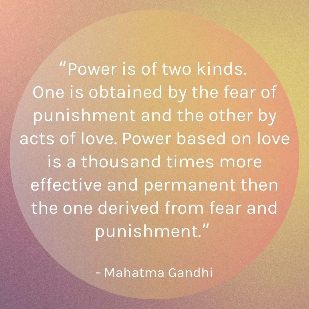 “Power is of two kinds. One is obtained by the fear of punishment and the other by acts of love. Power based on love is a thousand times more effective and permanent then the one derived from fear and punishment.” Mahatma Gandhi